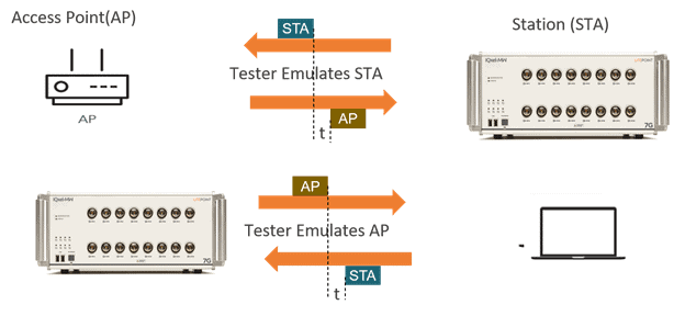 When testing a client station, the tester emulates an AP, generates a trigger frame and will measure the response with the signal analysis function. The tester measures the trigger-based PPDU generated by the station itself. The tester needs to measure the timing, frequency and power accuracy of this transmission from the client to ensure it meets the 802.11ax standard requirements and the RU leakage requirements.