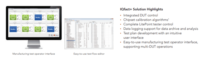 Pre-validated test software. When the product launch window is lost, it becomes key to recover as quickly as possible. LitePoint’s specific business model combines test hardware and a turnkey software solution. IQfact+ software is chipset-specific wireless test software, that enables thorough design verification and rapid volume manufacturing with minimal engineering effort. Test automation development is often a lengthy process, requiring intimate knowledge of the tester and the device under test (DUT) control and the ability to write a test.