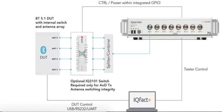 圖5給出了 AoA 和 AoD 發射器和接收器測試的完整測試設置。 LitePoint 的 IQxel-MW 7G 支援新的定向測試案例。 此外,LitePoint還提供 IQfact+ 套件,可為領先的藍牙 5.1 晶片組提供完全自動化的 DUT 和測試儀控制。